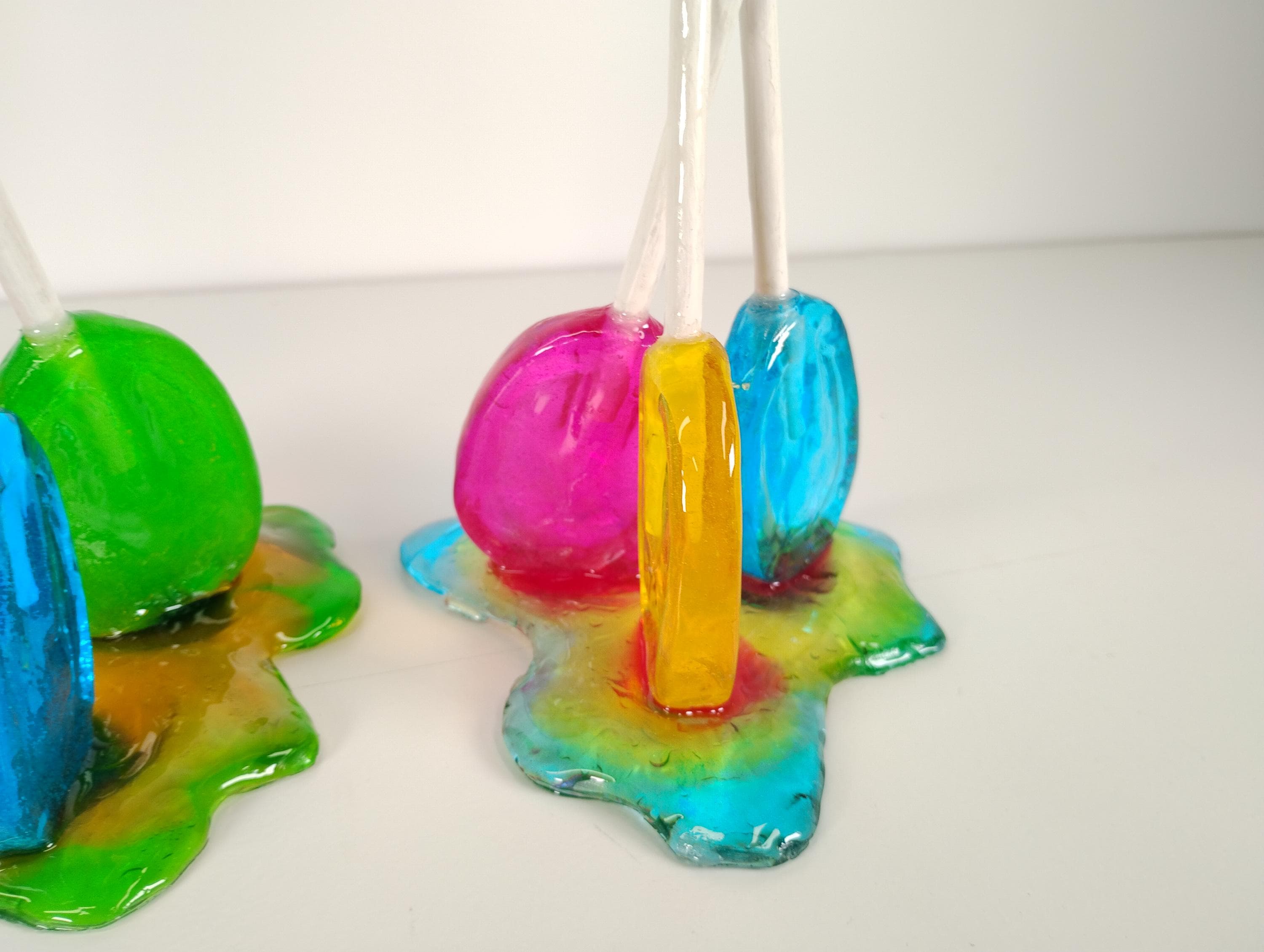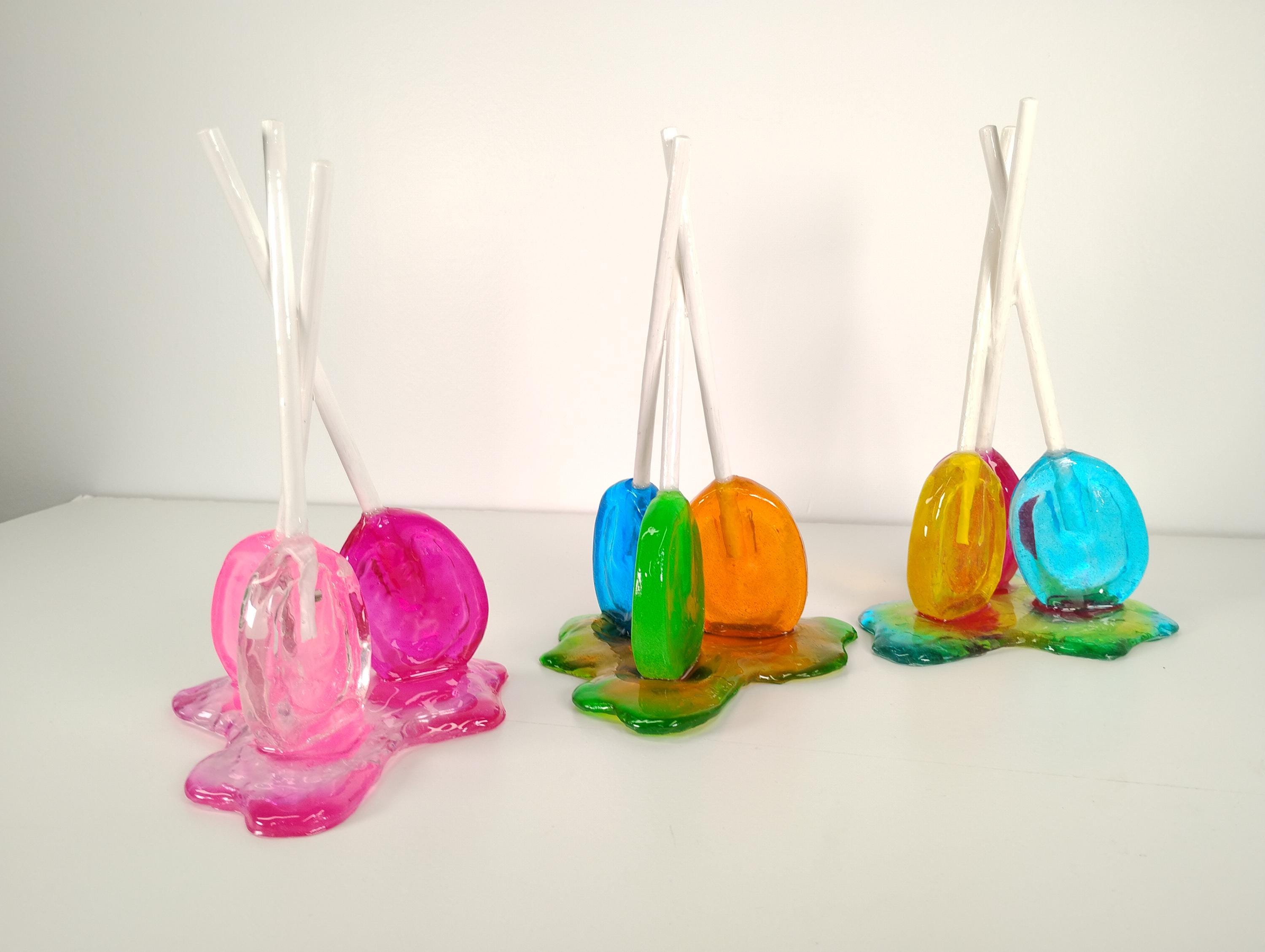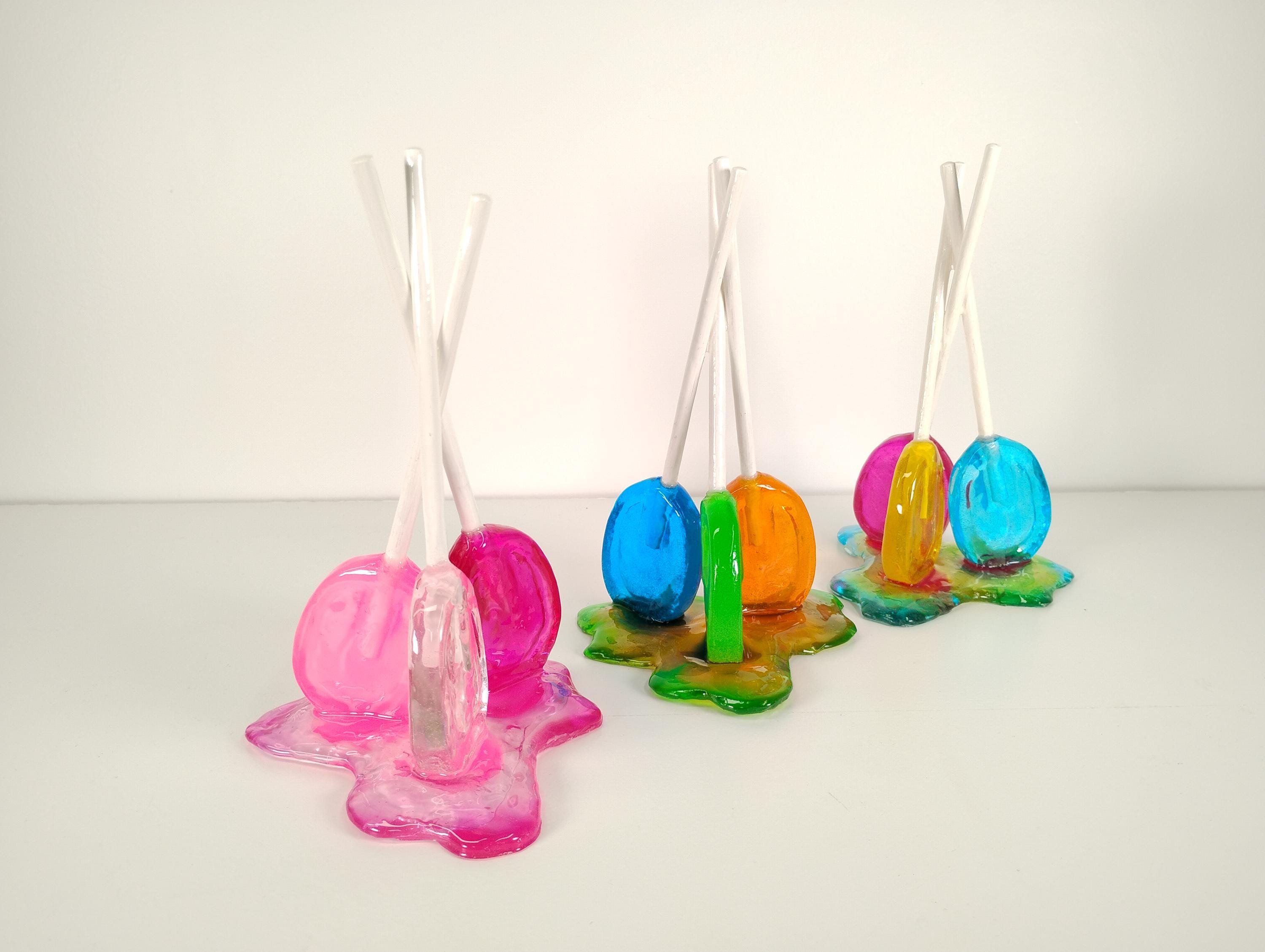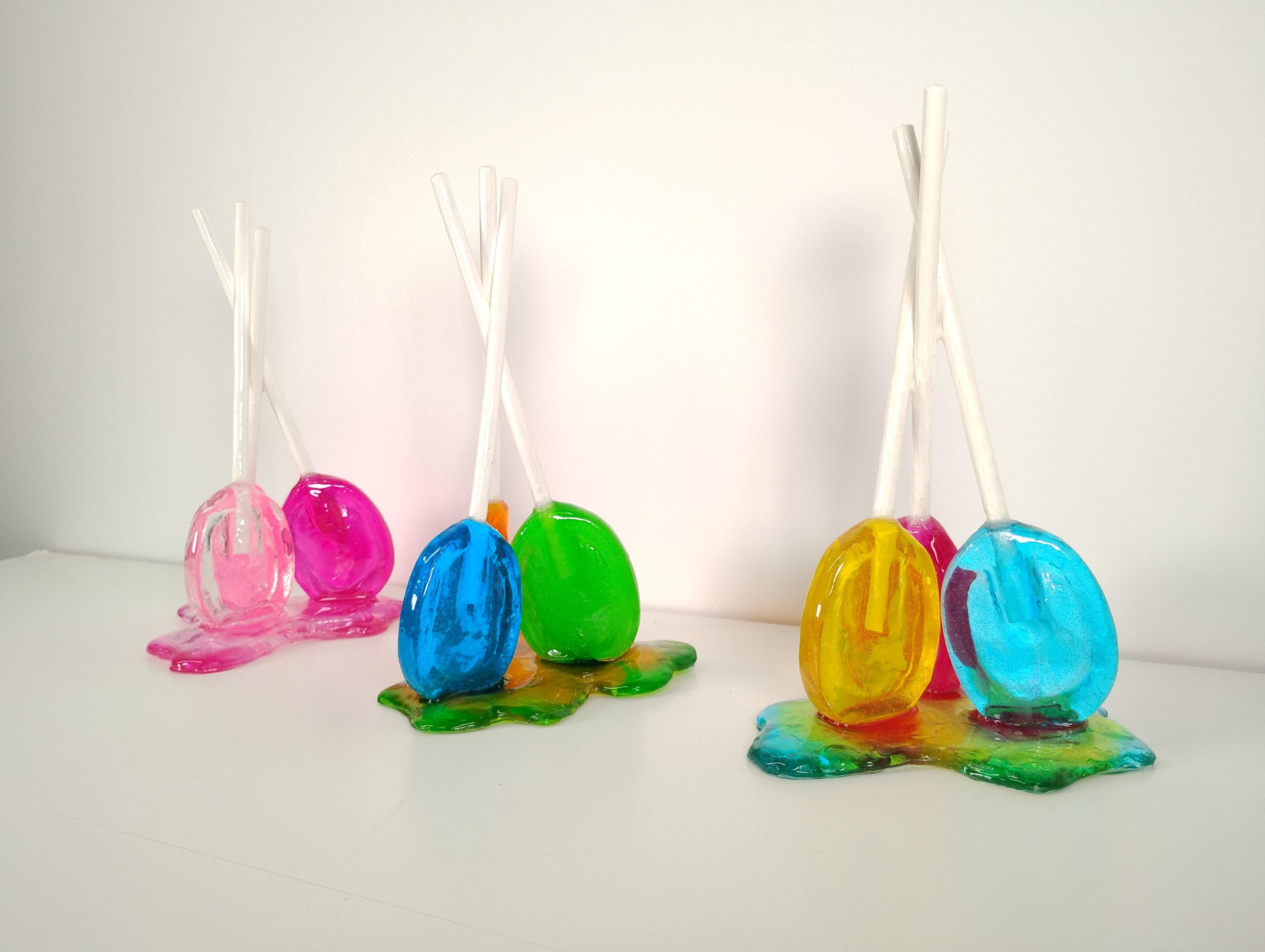 This gorgeous whimsical melting resin sucker sculpture has been handmade in my studio and colored with pigments.
