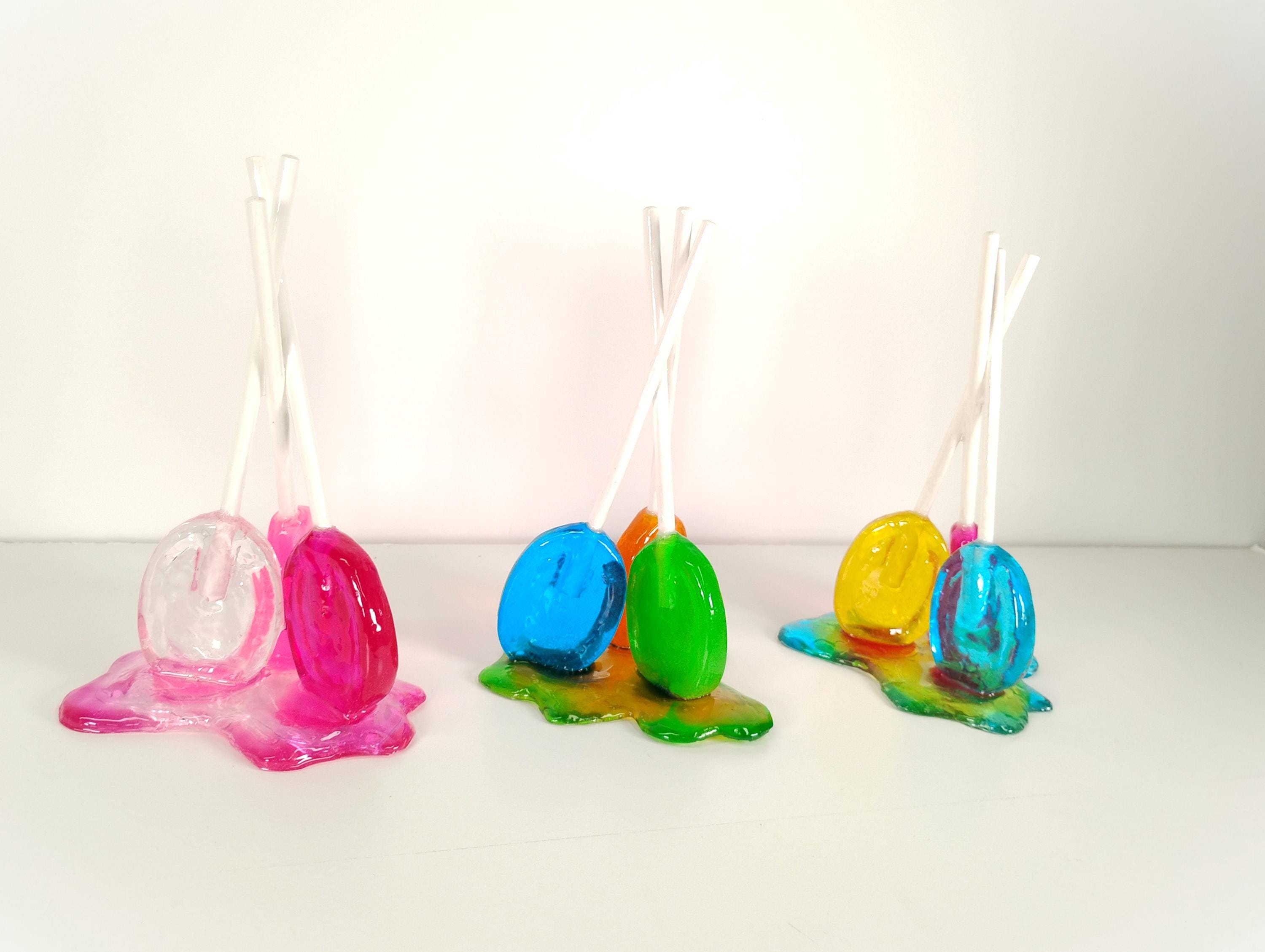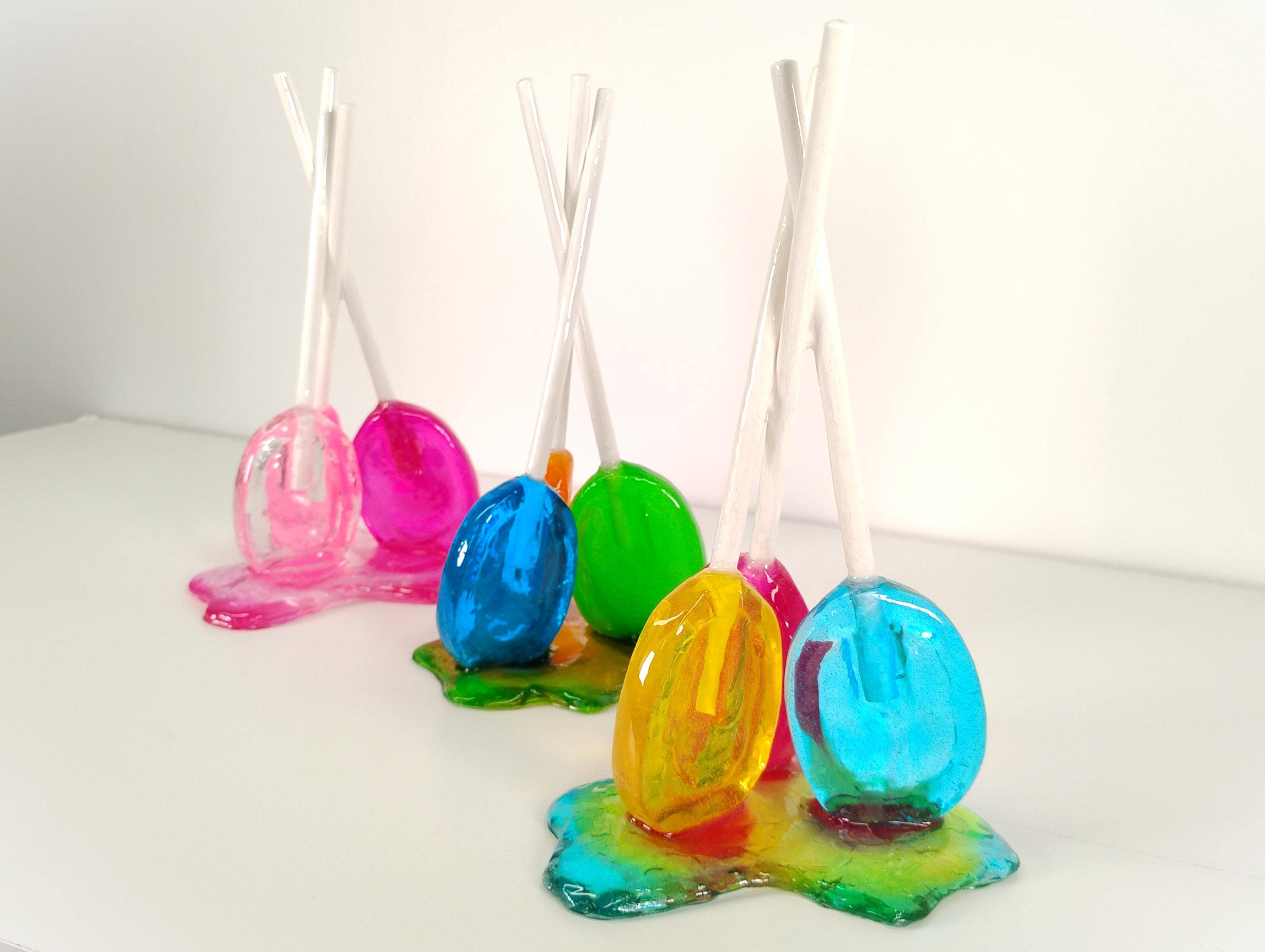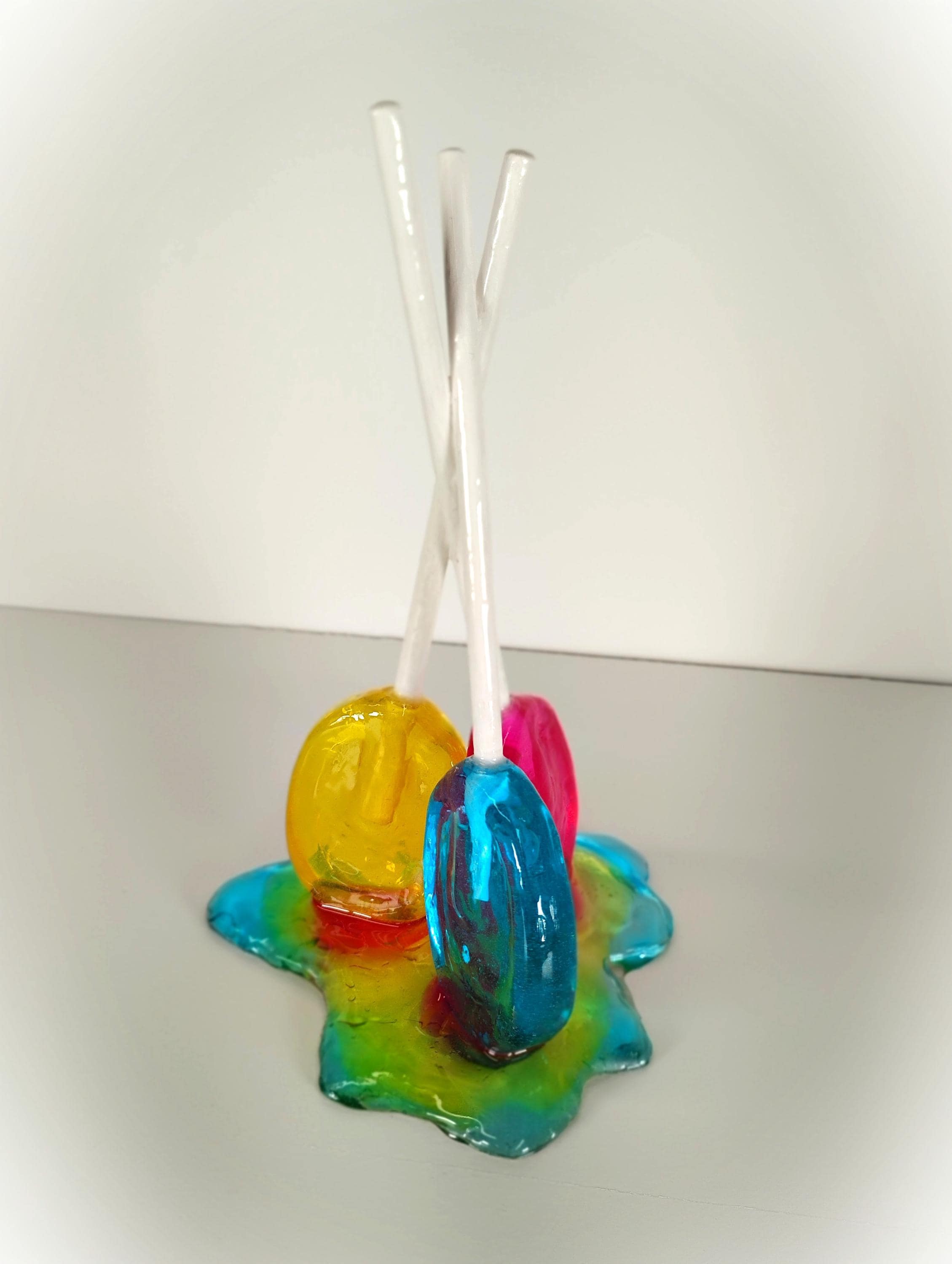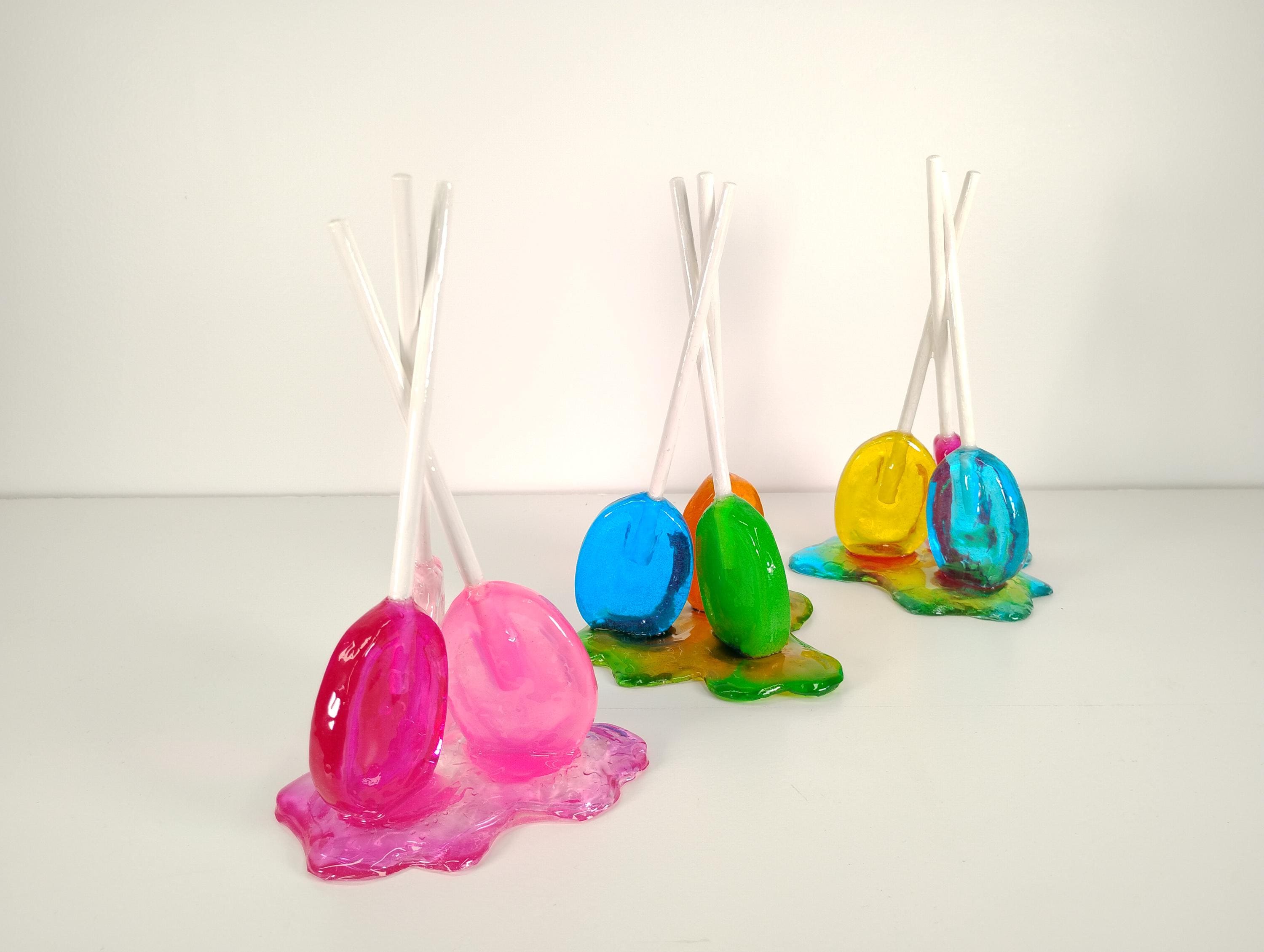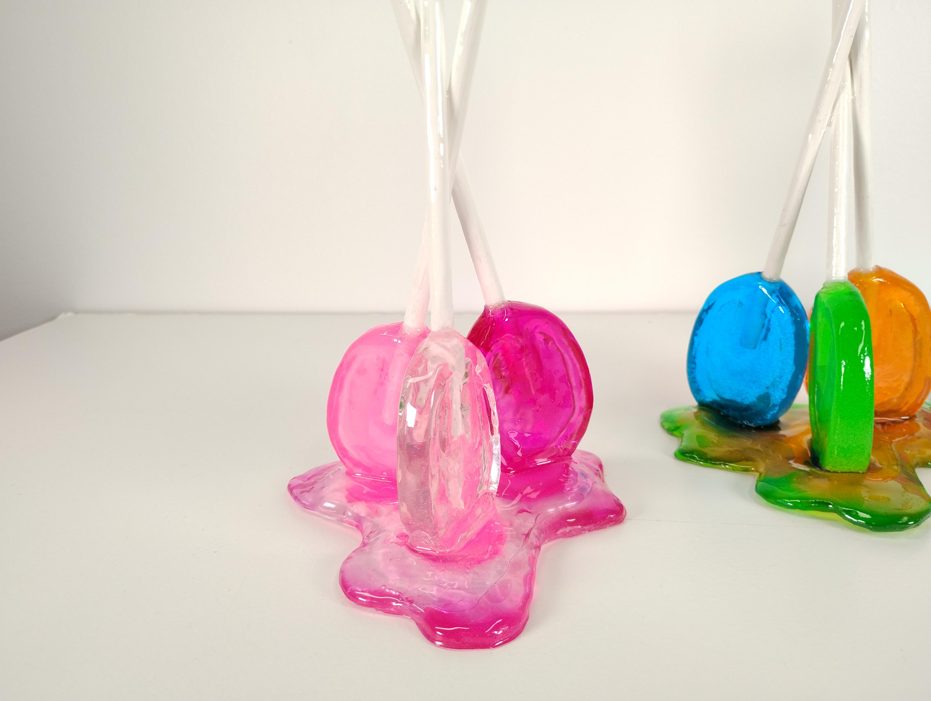 This gorgeous whimsical melting resin sucker sculpture has been handmade in my studio and colored with pigments.