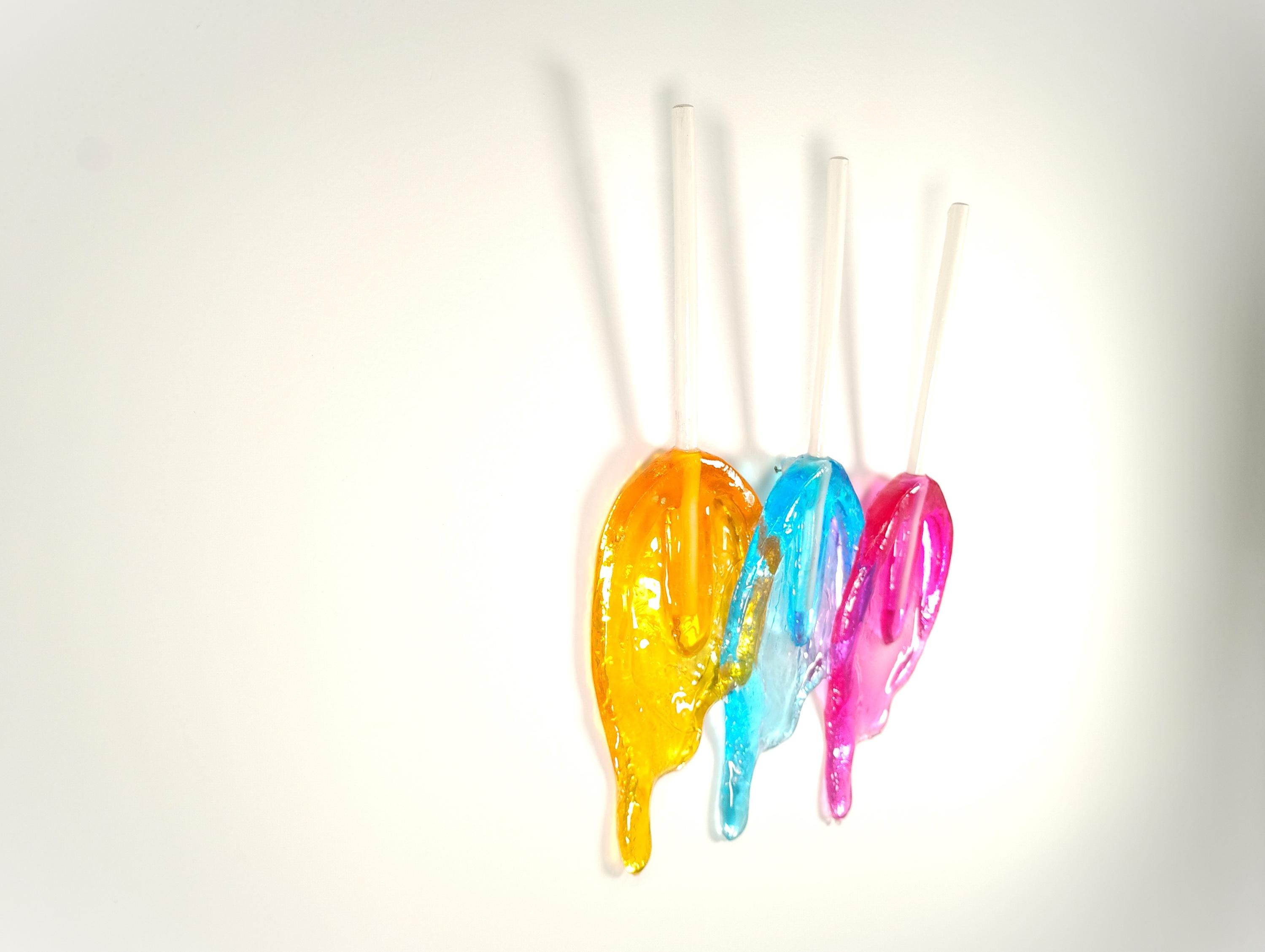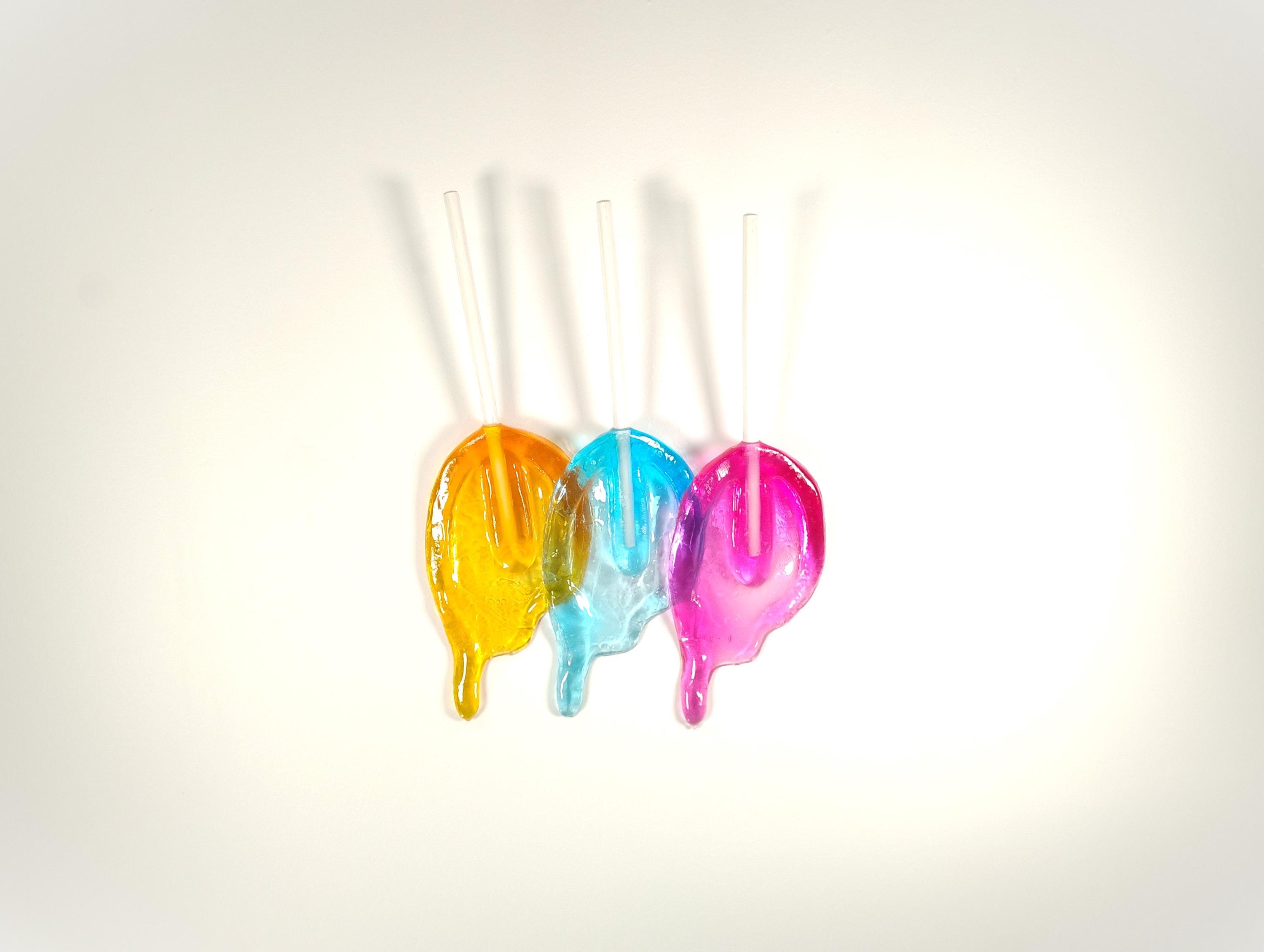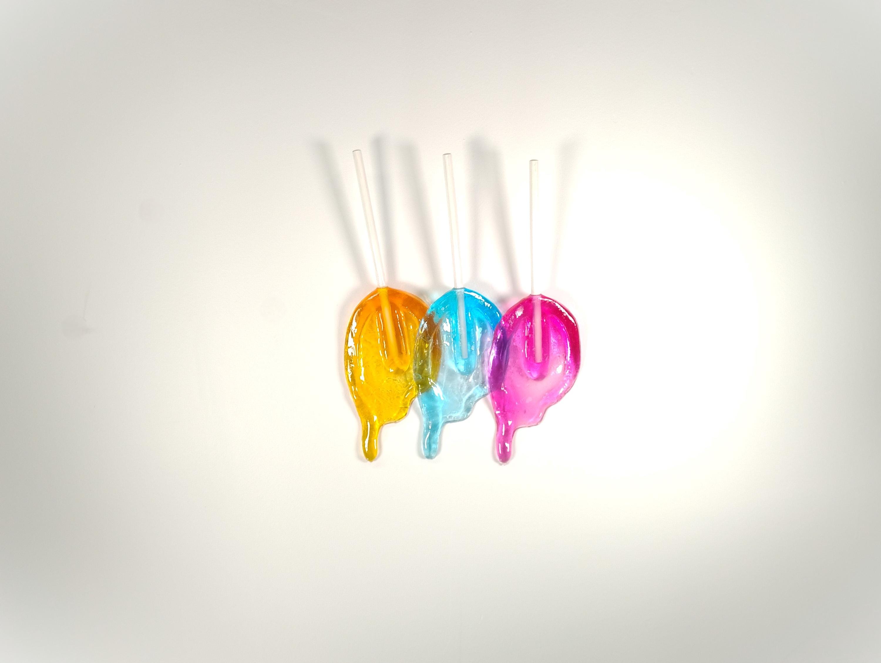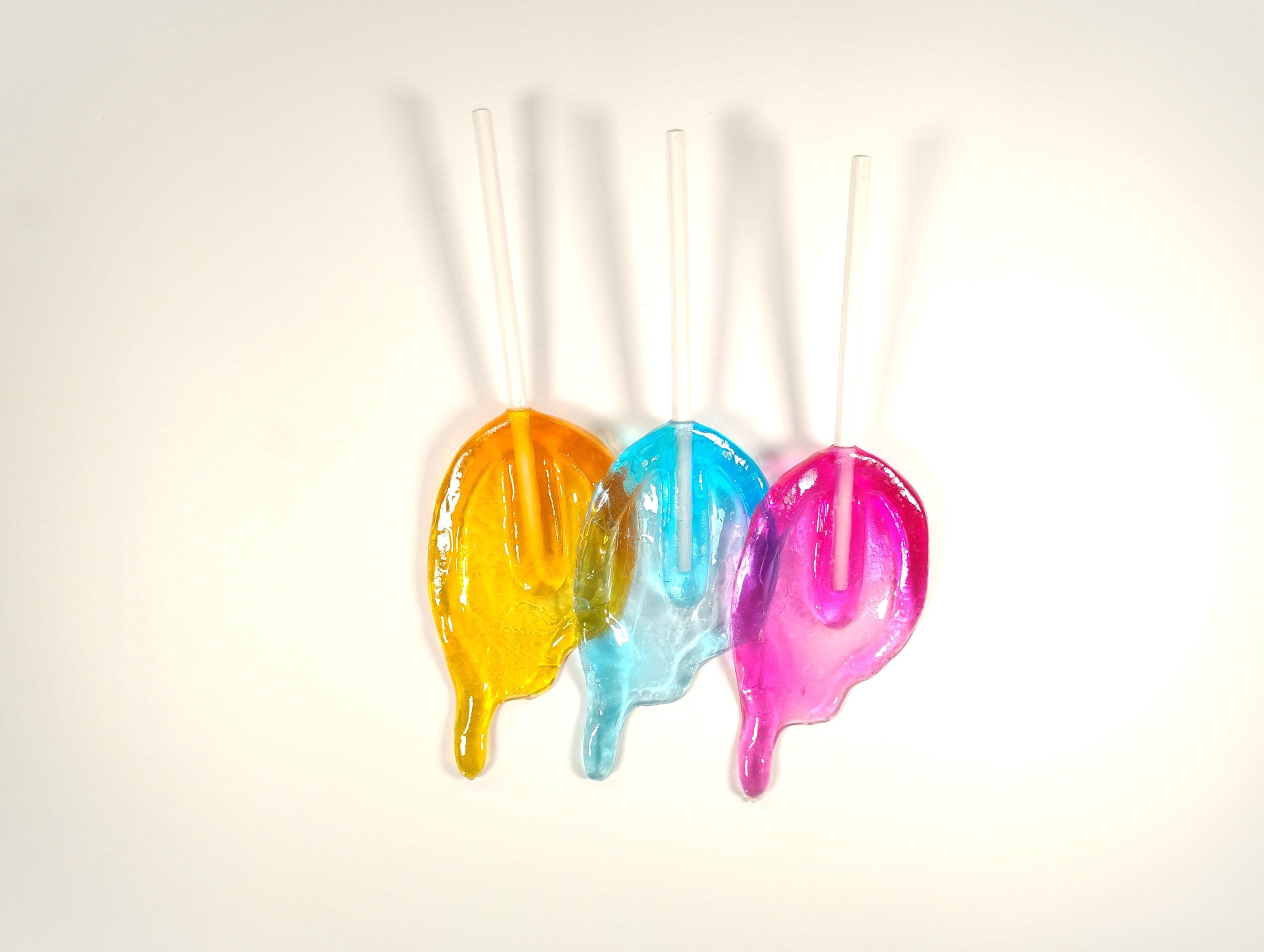 Wall hanging resin candy melting sucker sculpture.