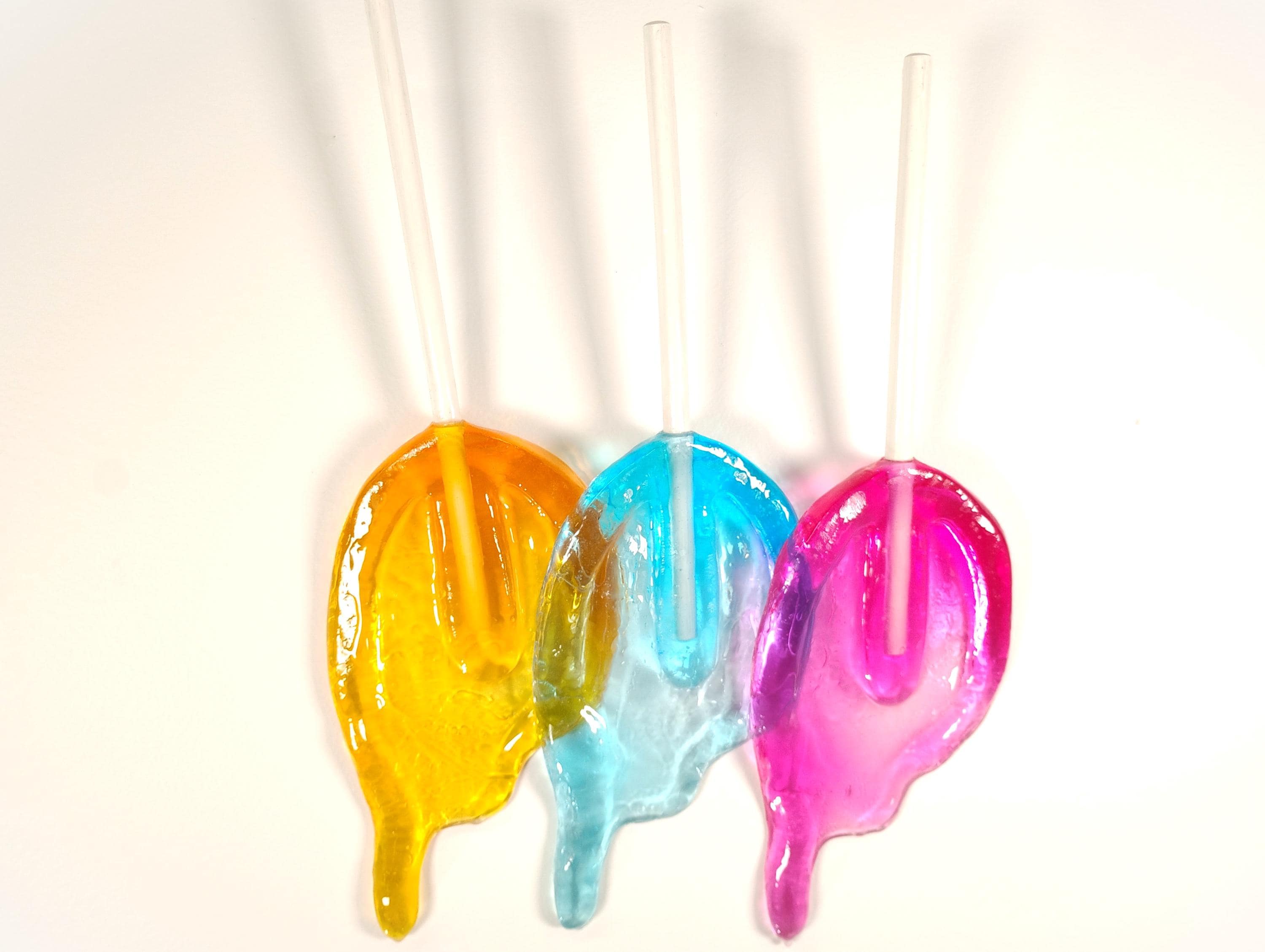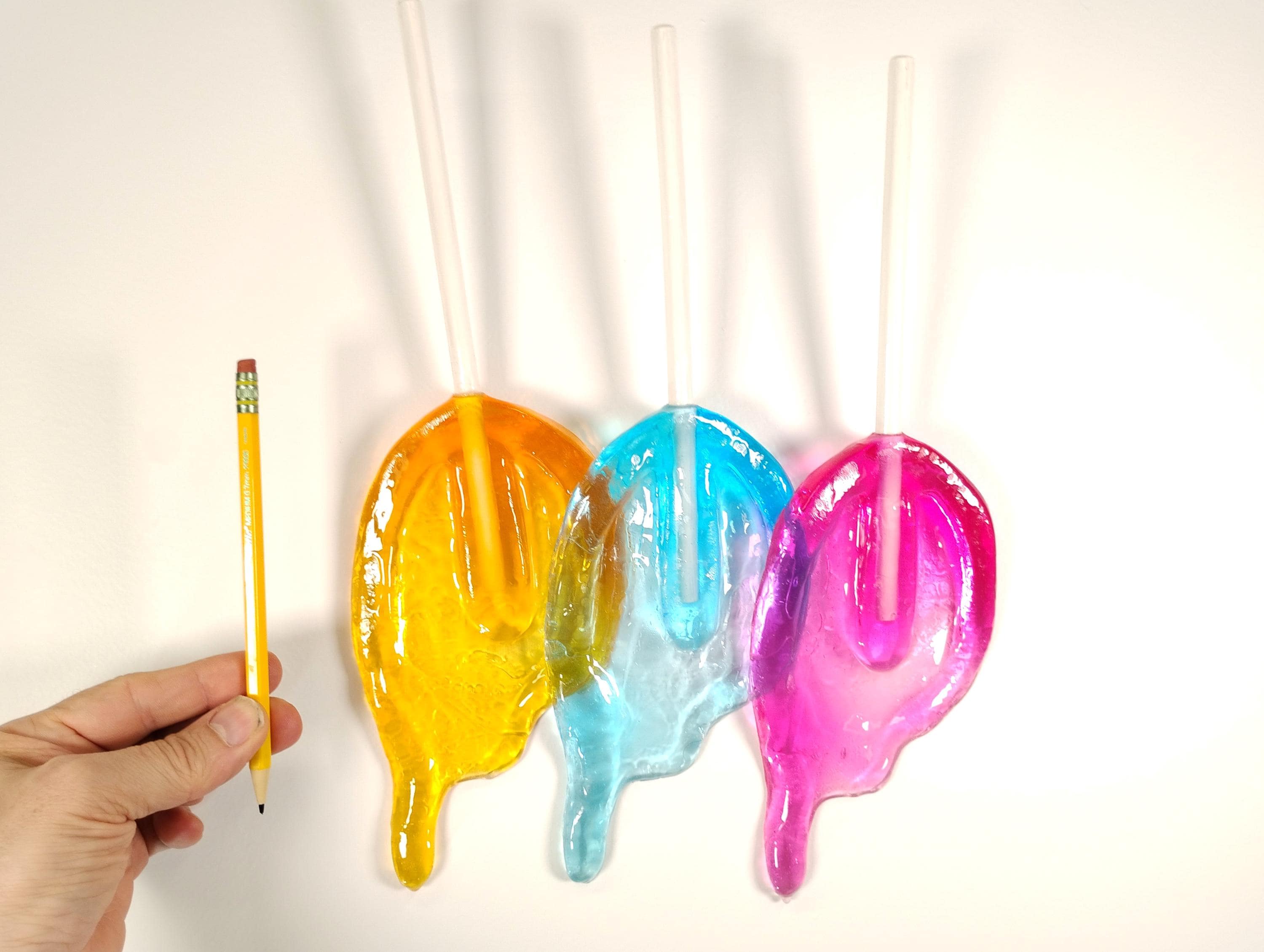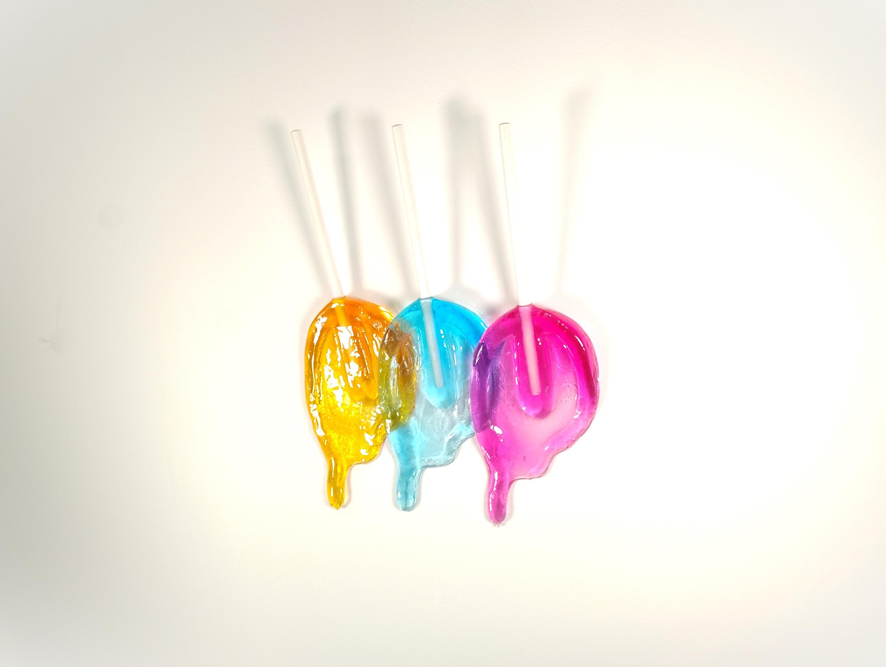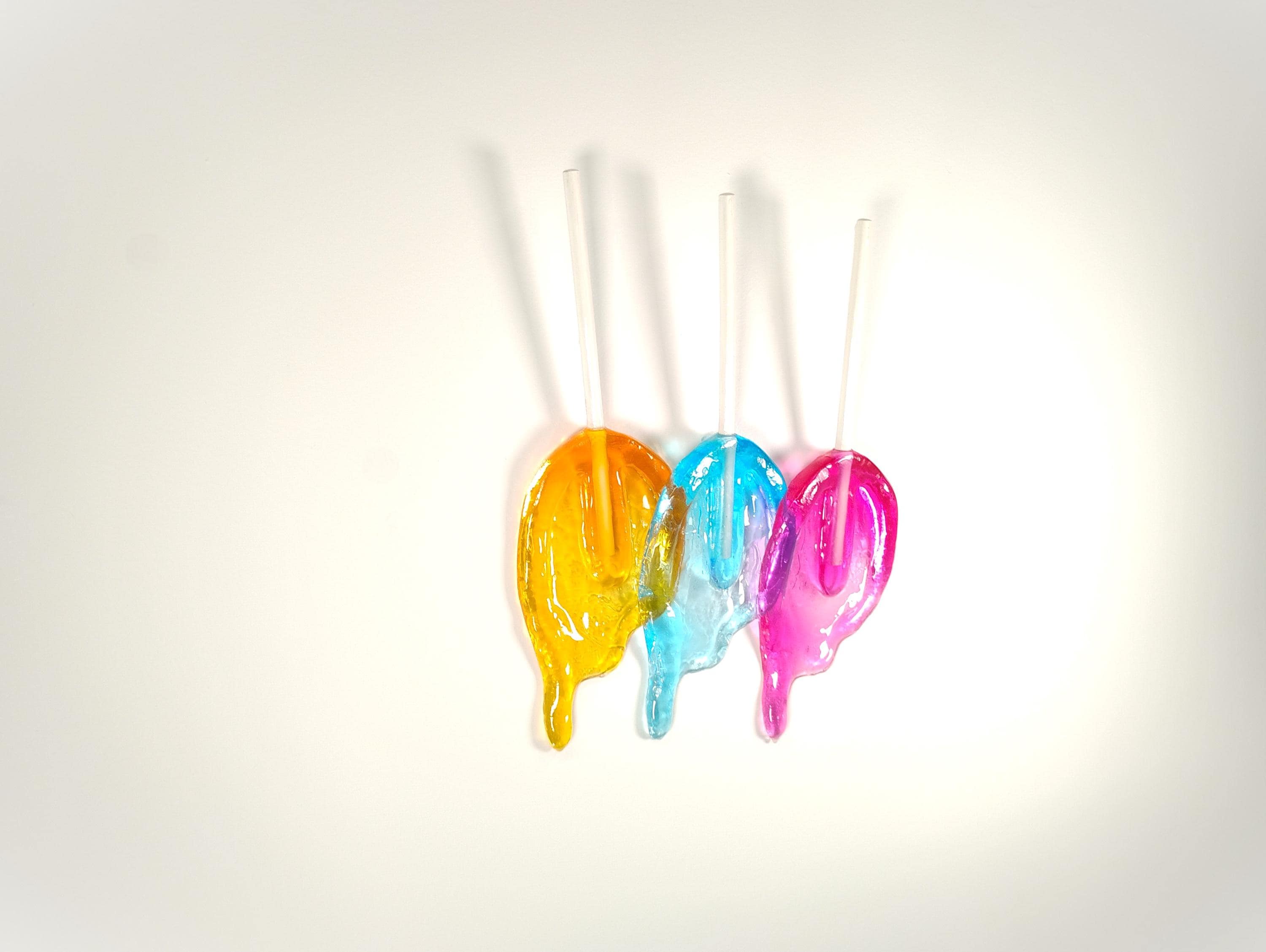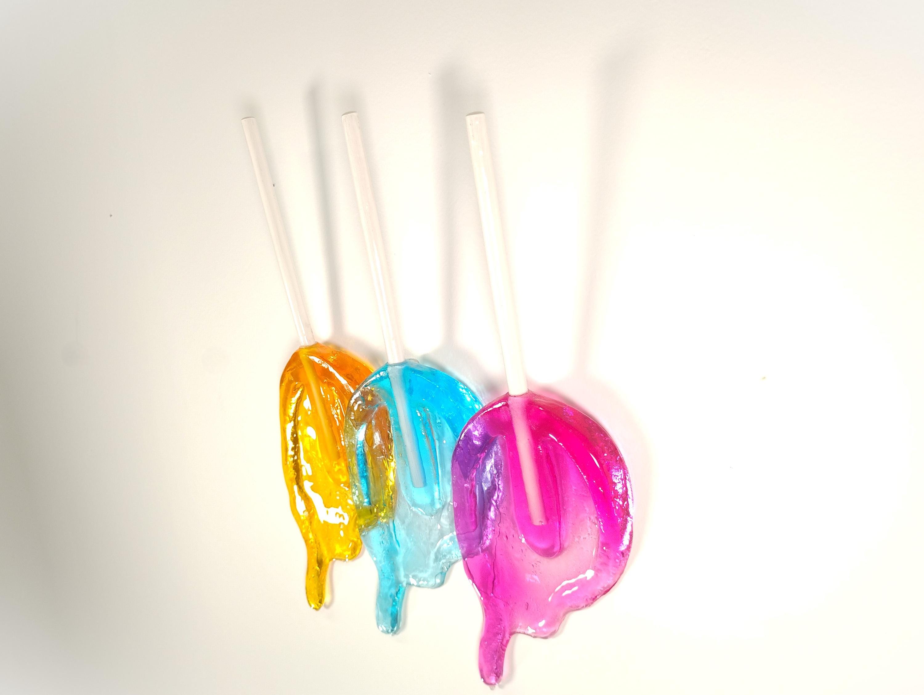 Wall hanging resin candy melting sucker sculpture.